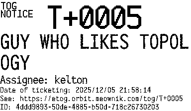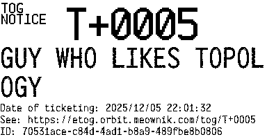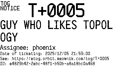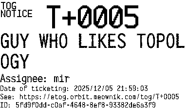 Orbit eTOG Listing Service: T+0005 GUY WHO LIKES TOPOLOGY