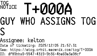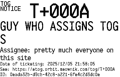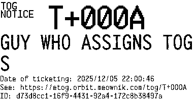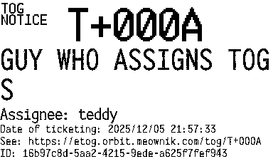 Orbit eTOG Listing Service: T+000A GUY WHO ASSIGNS TOGS