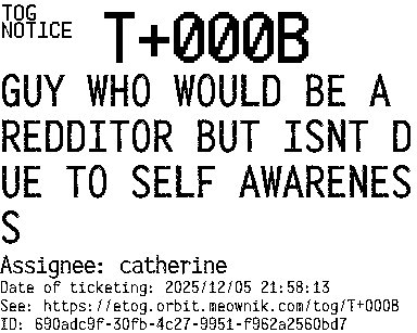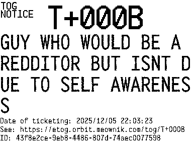 Orbit eTOG Listing Service: T+000B GUY WHO WOULD BE A REDDITOR BUT ISNT DUE TO SELF AWARENESS