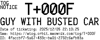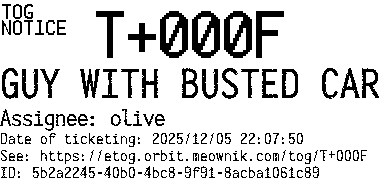 Orbit eTOG Listing Service: T+000F GUY WITH BUSTED CAR