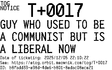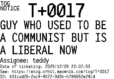Orbit eTOG Listing Service: T+0017 GUY WHO USED TO BE A COMMUNIST BUT IS A LIBERAL NOW