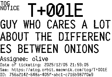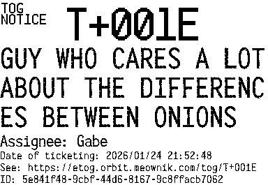 Orbit eTOG Listing Service: T+001E GUY WHO CARES A LOT ABOUT THE DIFFERENCES BETWEEN ONIONS