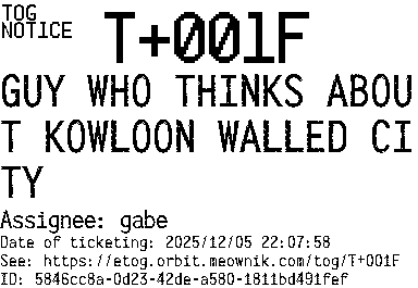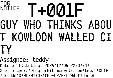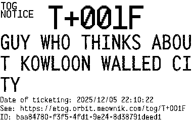 Orbit eTOG Listing Service: T+001F GUY WHO THINKS ABOUT KOWLOON WALLED CITY
