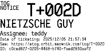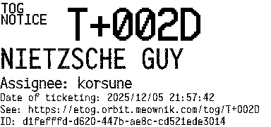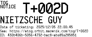 Orbit eTOG Listing Service: T+002D NIETZSCHE GUY