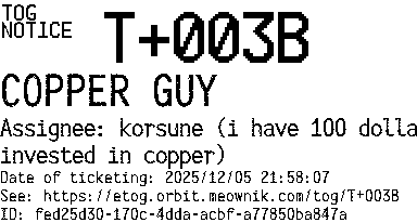 Orbit eTOG Listing Service: T+003B COPPER GUY