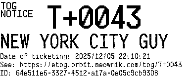 Orbit eTOG Listing Service: T+0043 NEW YORK CITY GUY