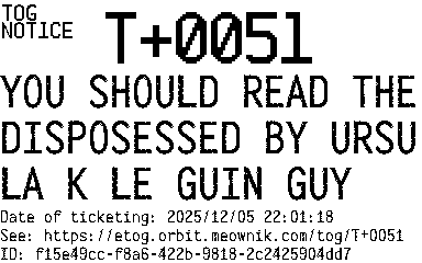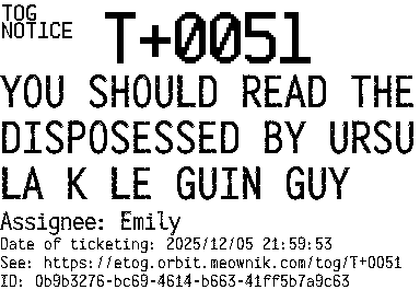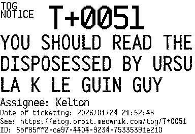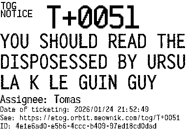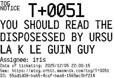 Orbit eTOG Listing Service: T+0051 YOU SHOULD READ THE DISPOSESSED BY URSULA K LE GUIN GUY