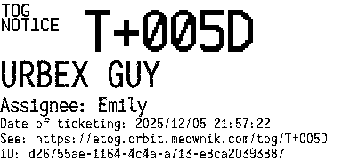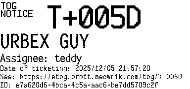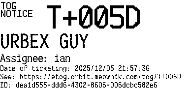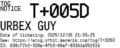 Orbit eTOG Listing Service: T+005D URBEX GUY