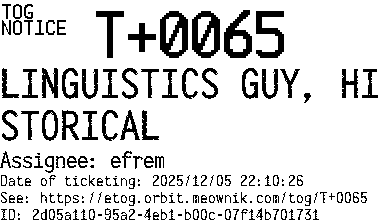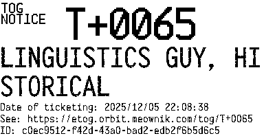 Orbit eTOG Listing Service: T+0065 LINGUISTICS GUY, HISTORICAL