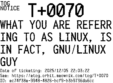 Orbit eTOG Listing Service: T+0070 WHAT YOU ARE REFERRING TO AS LINUX, IS IN FACT, GNU/LINUX GUY