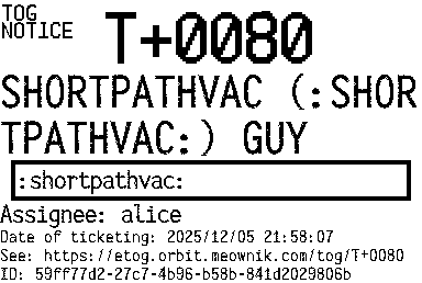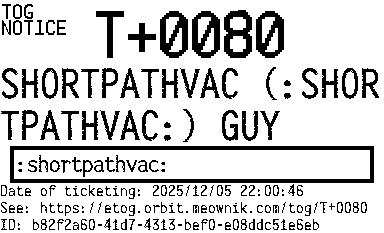 Orbit eTOG Listing Service: T+0080 SHORTPATHVAC (:SHORTPATHVAC:) GUY