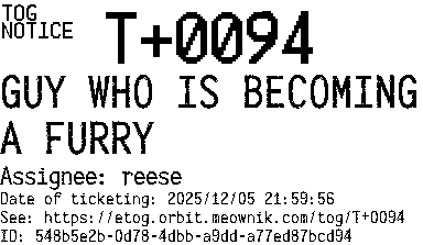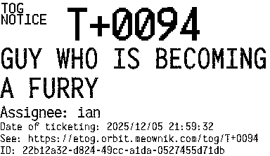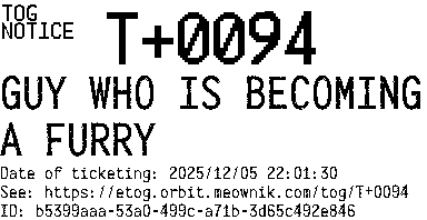 Orbit eTOG Listing Service: T+0094 GUY WHO IS BECOMING A FURRY