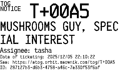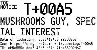 Orbit eTOG Listing Service: T+00A5 MUSHROOMS GUY, SPECIAL INTEREST