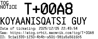 Orbit eTOG Listing Service: T+00A8 KOYAANISQATSI GUY