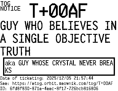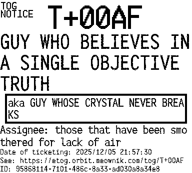 Orbit eTOG Listing Service: T+00AF GUY WHO BELIEVES IN A SINGLE OBJECTIVE TRUTH