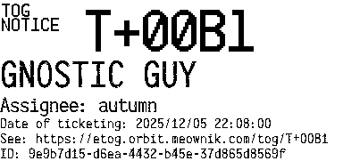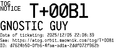 Orbit eTOG Listing Service: T+00B1 GNOSTIC GUY