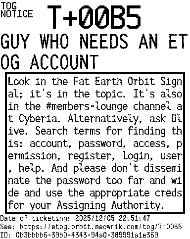 Description: Look in the Fat Earth Orbit Signal; it's in the topic. It's also in the #members-lounge channel at Cyberia. Alternatively, ask Olive. Search terms for finding this: account, password, access, permission, register, login, user, help. And please don't disseminate the password too far and wide and use the appropriate creds for your Assigning Authority.