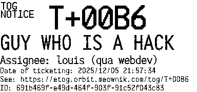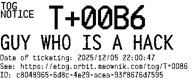 Orbit eTOG Listing Service: T+00B6 GUY WHO IS A HACK