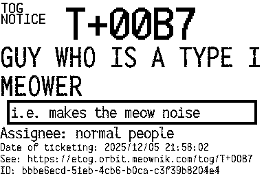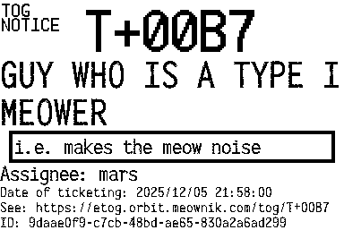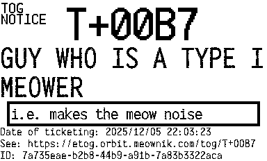 Orbit eTOG Listing Service: T+00B7 GUY WHO IS A TYPE I MEOWER