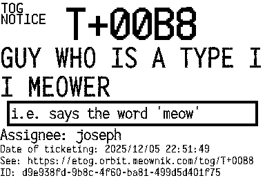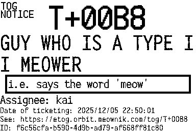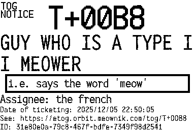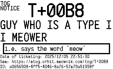 Orbit eTOG Listing Service: T+00B8 GUY WHO IS A TYPE II MEOWER