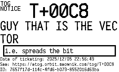 Orbit eTOG Listing Service: T+00C8 GUY THAT IS THE VECTOR