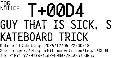 Orbit eTOG Listing Service: T+00D4 GUY THAT IS SICK, SKATEBOARD TRICK