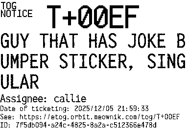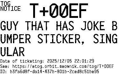 Orbit eTOG Listing Service: T+00EF GUY THAT HAS JOKE BUMPER STICKER, SINGULAR