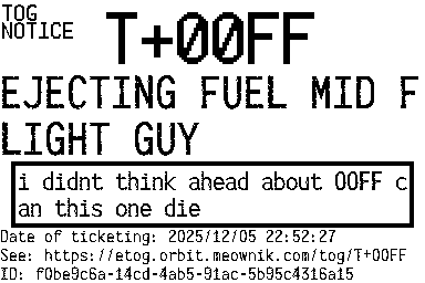 Orbit eTOG Listing Service: T+00FF EJECTING FUEL MID FLIGHT GUY