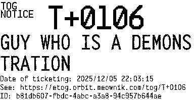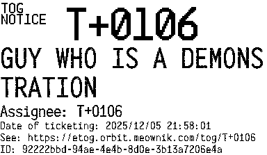 Orbit eTOG Listing Service: T+0106 GUY WHO IS A DEMONSTRATION