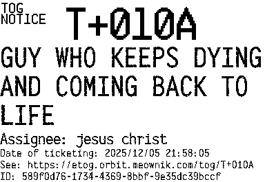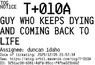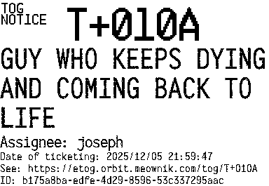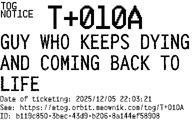Orbit eTOG Listing Service: T+010A GUY WHO KEEPS DYING AND COMING BACK TO LIFE