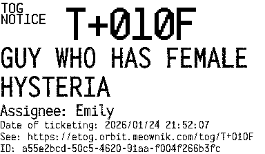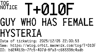 Orbit eTOG Listing Service: T+010F GUY WHO HAS FEMALE HYSTERIA