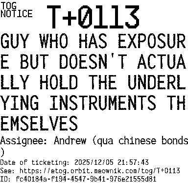 Orbit eTOG Listing Service: T+0113 GUY WHO HAS EXPOSURE BUT DOESN'T ACTUALLY HOLD THE UNDERLYING INSTRUMENTS THEMSELVES