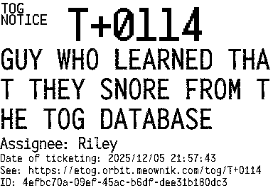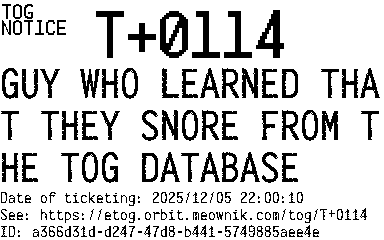Orbit eTOG Listing Service: T+0114 GUY WHO LEARNED THAT THEY SNORE FROM THE TOG DATABASE
