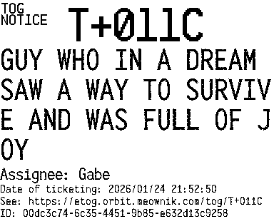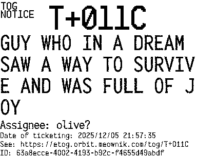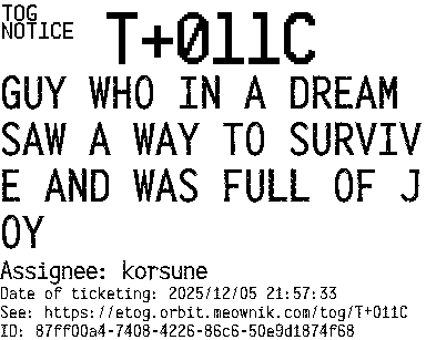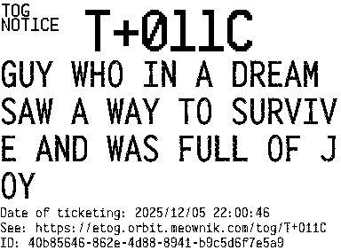 Orbit eTOG Listing Service: T+011C GUY WHO IN A DREAM SAW A WAY TO SURVIVE AND WAS FULL OF JOY