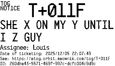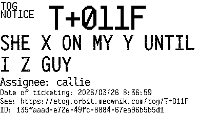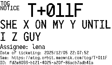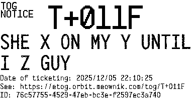 Orbit eTOG Listing Service: T+011F SHE X ON MY Y UNTIL I Z GUY