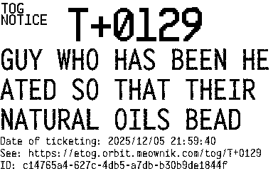 Orbit eTOG Listing Service: T+0129 GUY WHO HAS BEEN HEATED SO THAT THEIR NATURAL OILS BEAD