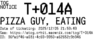 Orbit eTOG Listing Service: T+014A PIZZA GUY, EATING