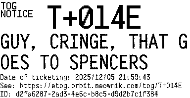 Orbit eTOG Listing Service: T+014E GUY, CRINGE, THAT GOES TO SPENCERS