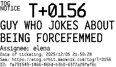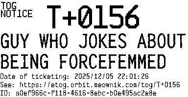 Orbit eTOG Listing Service: T+0156 GUY WHO JOKES ABOUT BEING FORCEFEMMED