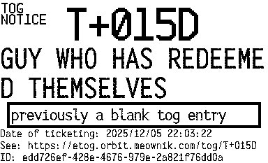 Orbit eTOG Listing Service: T+015D GUY WHO HAS REDEEMED THEMSELVES