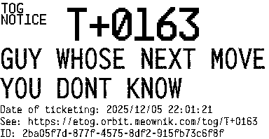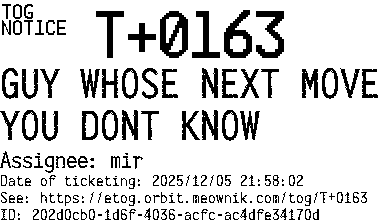 Orbit eTOG Listing Service: T+0163 GUY WHOSE NEXT MOVE YOU DONT KNOW