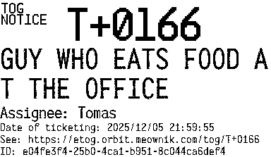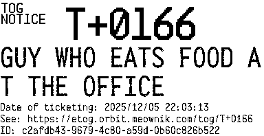 Orbit eTOG Listing Service: T+0166 GUY WHO EATS FOOD AT THE OFFICE
