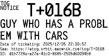 Orbit eTOG Listing Service: T+016B GUY WHO HAS A PROBLEM WITH CARS