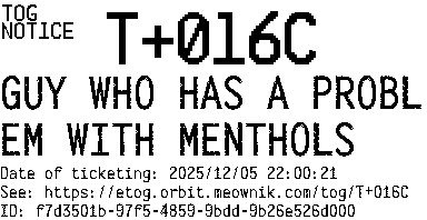 Orbit eTOG Listing Service: T+016C GUY WHO HAS A PROBLEM WITH MENTHOLS