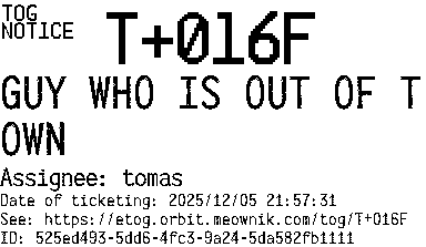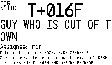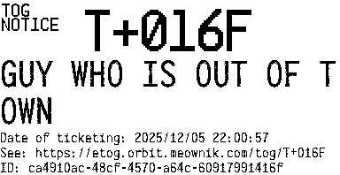 Orbit eTOG Listing Service: T+016F GUY WHO IS OUT OF TOWN