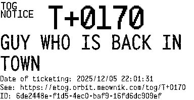 Orbit eTOG Listing Service: T+0170 GUY WHO IS BACK IN TOWN