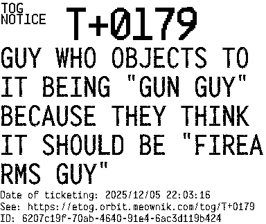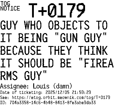 Orbit eTOG Listing Service: T+0179 GUY WHO OBJECTS TO IT BEING "GUN GUY" BECAUSE THEY THINK IT SHOULD BE "FIREARMS GUY"