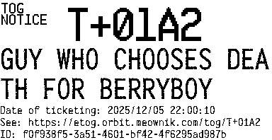 Orbit eTOG Listing Service: T+01A2 GUY WHO CHOOSES DEATH FOR BERRYBOY