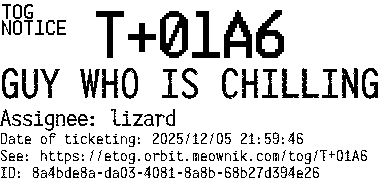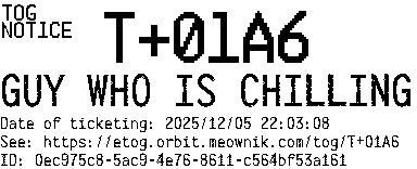 Orbit eTOG Listing Service: T+01A6 GUY WHO IS CHILLING