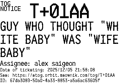 Orbit eTOG Listing Service: T+01AA GUY WHO THOUGHT "WHITE BABY" WAS "WIFE BABY"